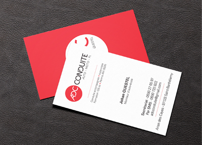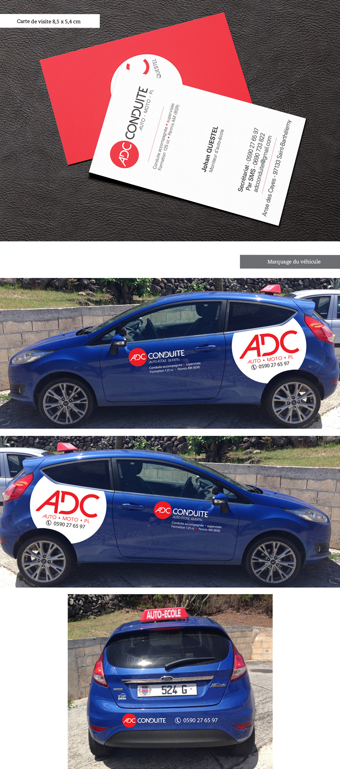 Réalisation d'une identité visuelle pour l'auto école ADC Conduite - création du logotype - création et mise en page de la carte de visite (recto-verso format 8,5 x 5,4 cm) - création du marquage du véhicule