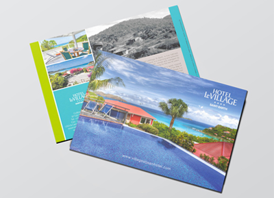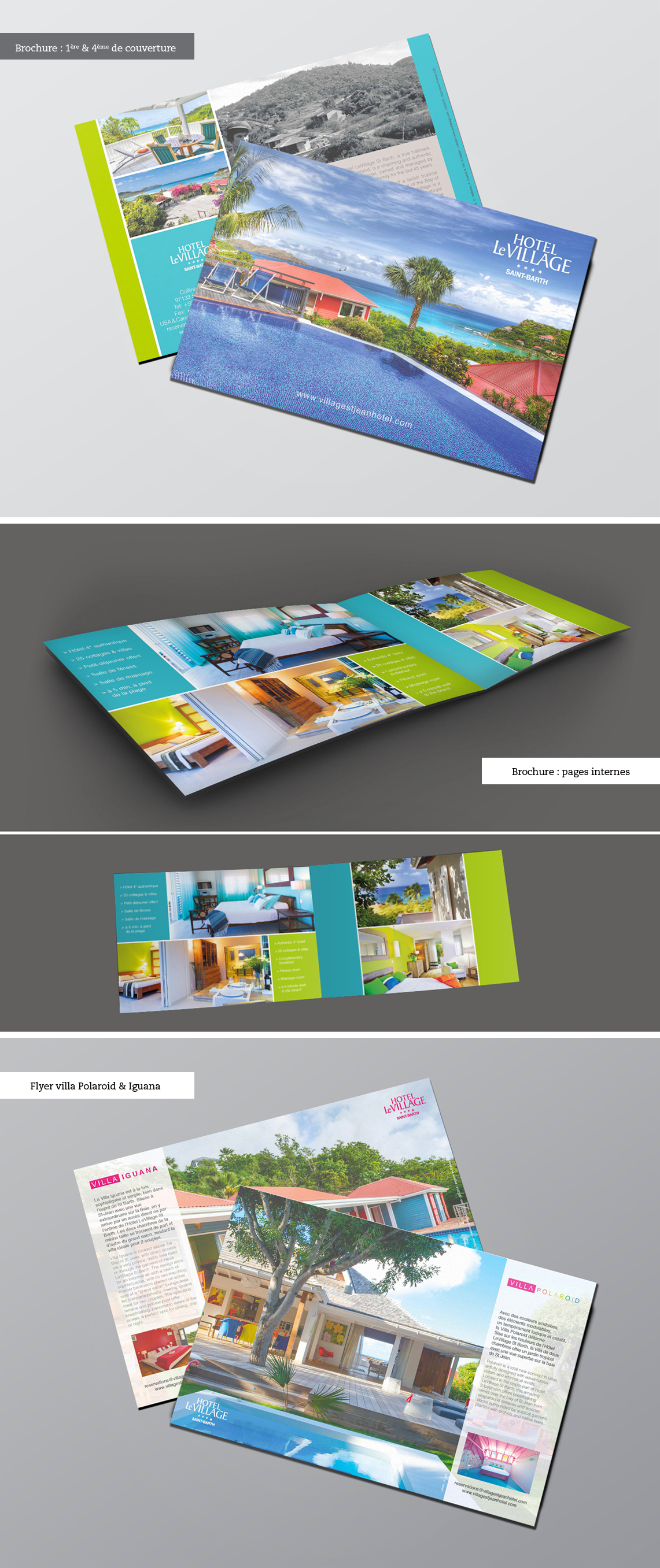 Réalisation et mise en page d'une brochure de 4 pages (format A5) pour l'Hôtel Le Village - mise en page du flyer villa (recto-verso format A5)