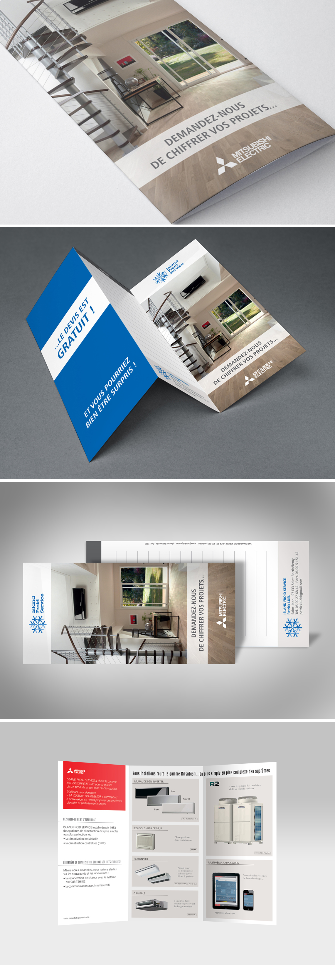 Réalisation et mise en page d'un dépliant 3 volets pour une entreprise qui fait la pose et entretien de climatiseurs. Le dépliant présente l'histoire de l'entreprise ainsi que les prestations