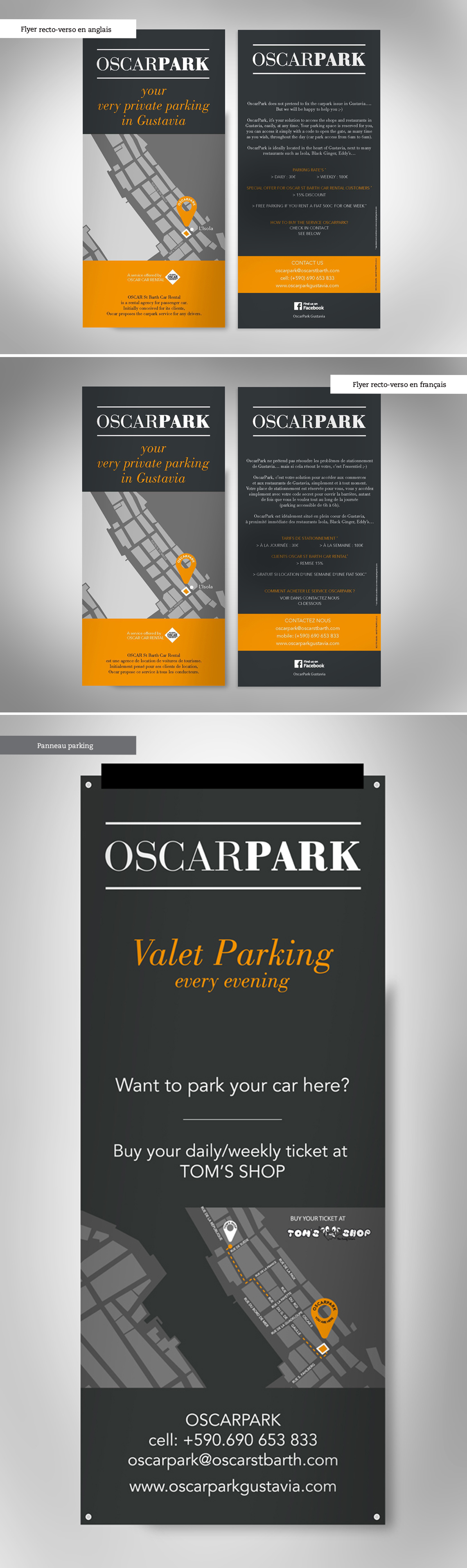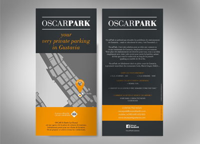 Réalisation d'une identité visuelle pour l'entreprise Oscarpark (parking privé) - mise en page du flyer FR-ANG (recto-verso format 10 x 20 cm) - mise en page du panneau parking (format 65 x 160 cm)