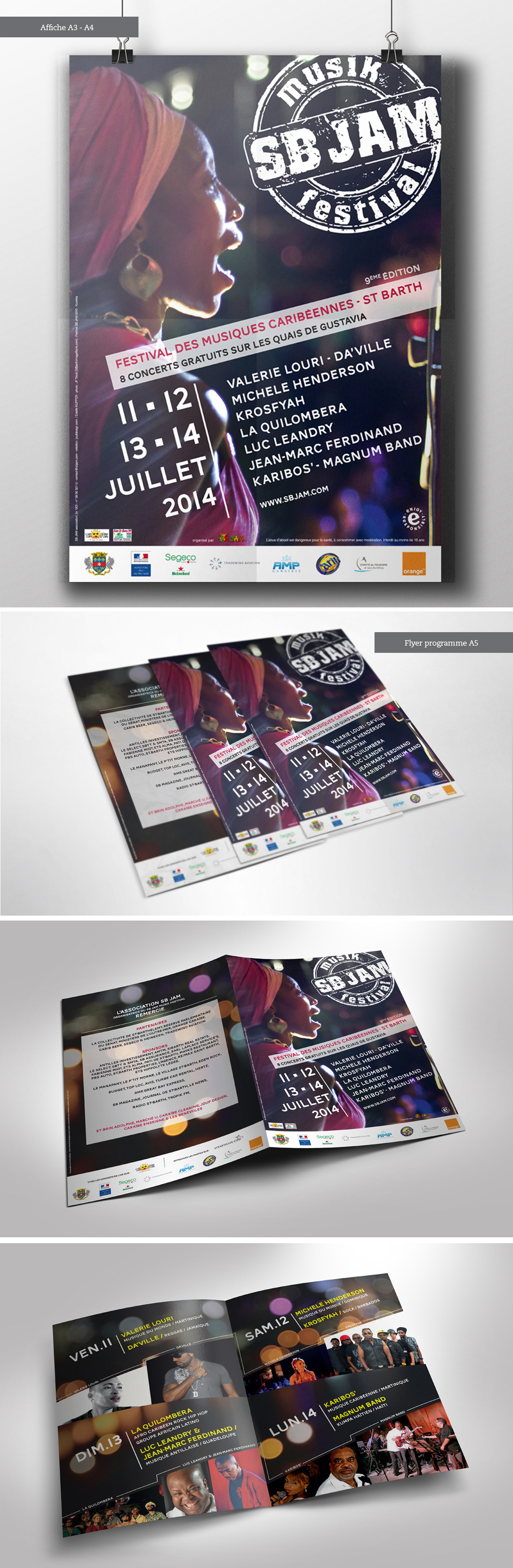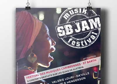 Réalisation d'une identité visuelle pour le festival de musique caribéenne SB JAM - Affiche format A4-A3 - Flyer programme recto-verso format A5 (format fermé) A4 (format ouvert) - Bâche pour la ville - Annonce presse pour les journaux locaux (News - Le Journal de St Barth,...)
