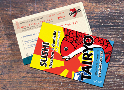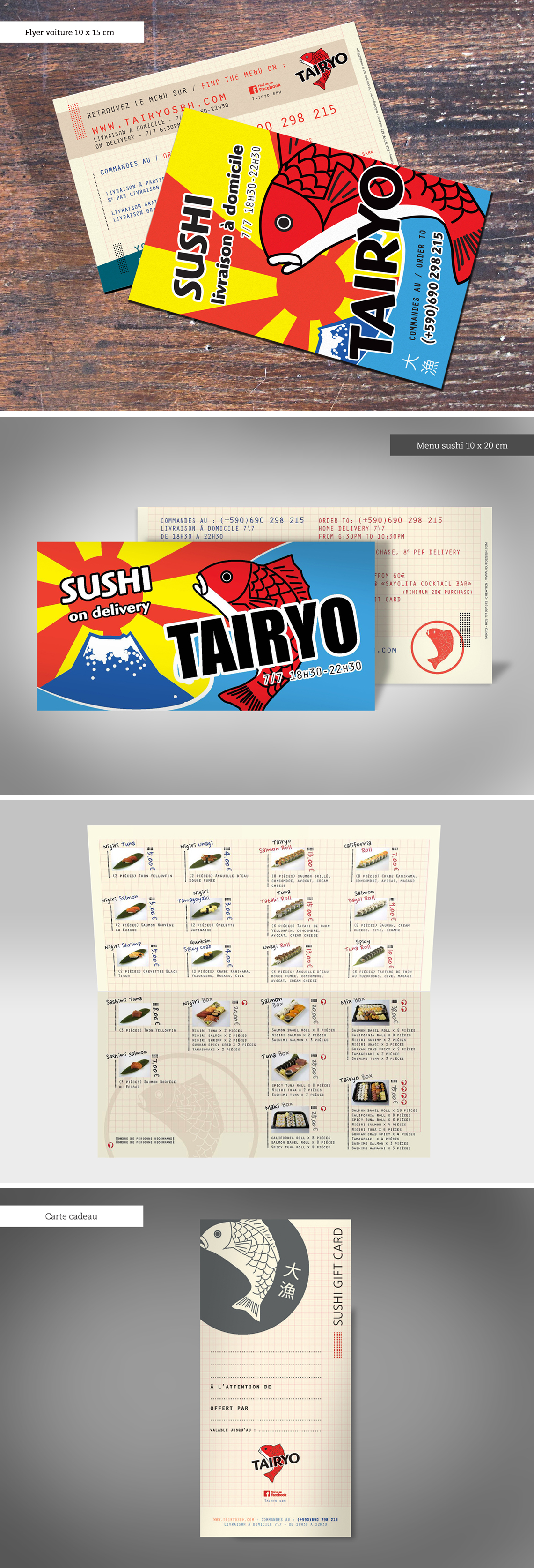 Réalisation d'une identité visuelle pour l'entreprise Tairyo "Maître sushi" - refonte du logotype en vecteur - réalisation de l'illustration en vecteur - création et mise en page du menu sushi (recto-verso format 10 x 20 cm) - création et mise en page du flyer pour les véhicules (recto-verso format 10 x 15 cm) - création et mise en page des cartes cadeaux (recto seul format 10 x 20 cm)