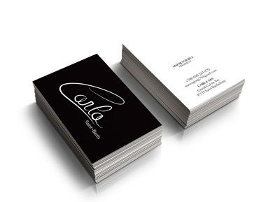 Réalisation et mise en page de la carte de visite (recto-verso format 8,5 x 5,4 cm) pour la boutique Carla - vente de vêtement de luxe italien - refonte du logotype
