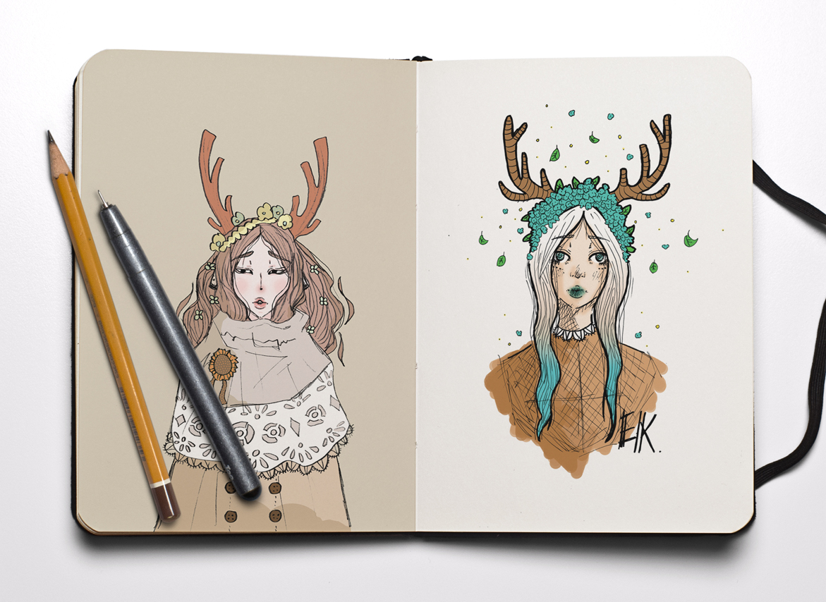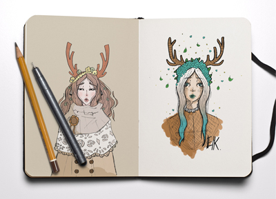 Création de deux illustrations "fille-cerf" fait au crayon de papier puis mis en couleurs par Photoshop