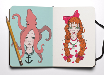 Création de deux illustrations "fille-poulpe" & "fille-bonbon" fait au crayon de papier puis mis en couleurs par Photoshop